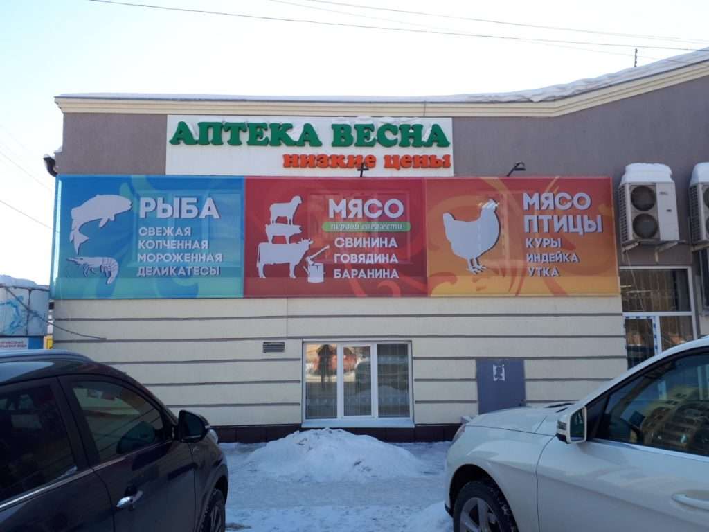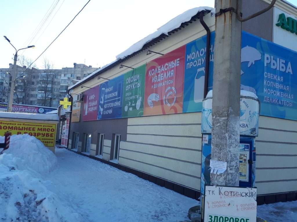 Печать и монтаж банерной сетки на металлокаркас расположенный на фасаде торгового комплекса «Котинский». Подсветка светодиодными прожекторами 50 Вт.