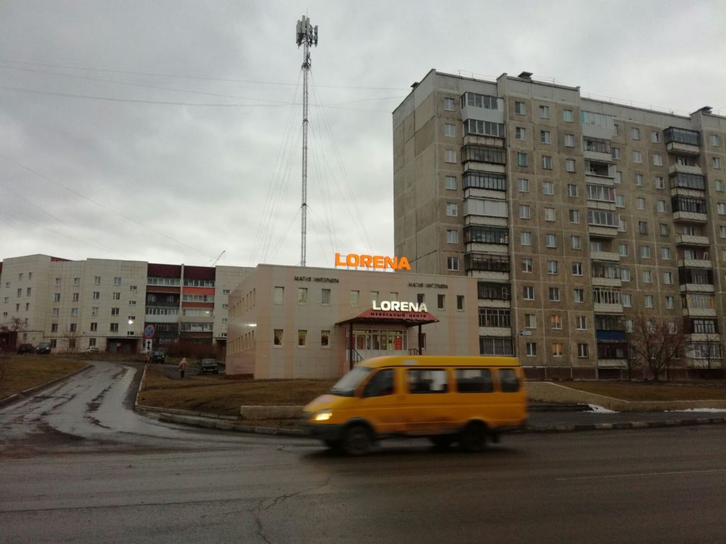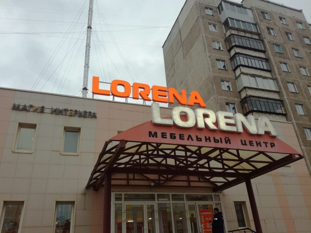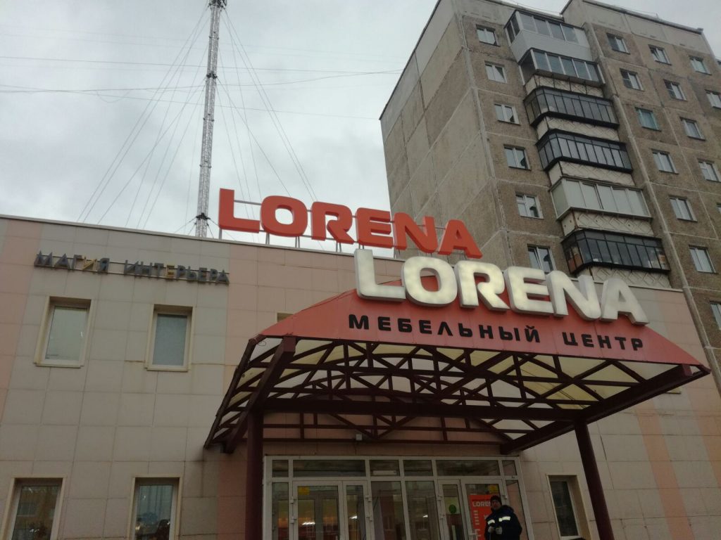 Объемные световые буквы крышной установки «LORENA» Установлены на металлораме из профильной трубы 40х60мм с окраской. Крепление металлорамы осуществлено в несущие конструкции здания.
